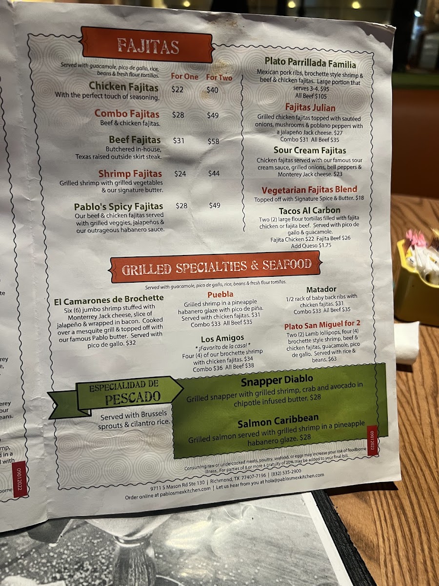 Introducing the menu at Pablo's Mexican Kitchen, where the vibrant flavors of Mexico come alive in every dish. Located in Richmond, TX, this culinary gem prides itself on serving authentic, high-quality Mexican fare. The fajitas are a standout, featuring certified Hereford beef or fresh grilled chicken, each marinated in-house and presented alongside guacamole, pico de gallo, rice, beans, and fresh tortillas.